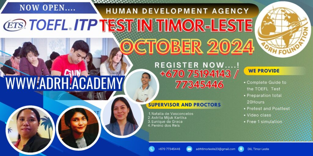 TOEFL or Test of English as a Foreign Language, is English Proficiency Tests that is usually used by many people to pursue higher education or to work with English speaking companies. Partnering with One Stop English Education (Indonesian English Foundation Official Partner), ADRH becomes one English Course that provides TOEFL Test for those who need it. People in Dili are possible to take TOEFL ITP Test or TOEFL iBT Test. ADRH also offers the Preparation Class for TOEFL Test in flexible duration.